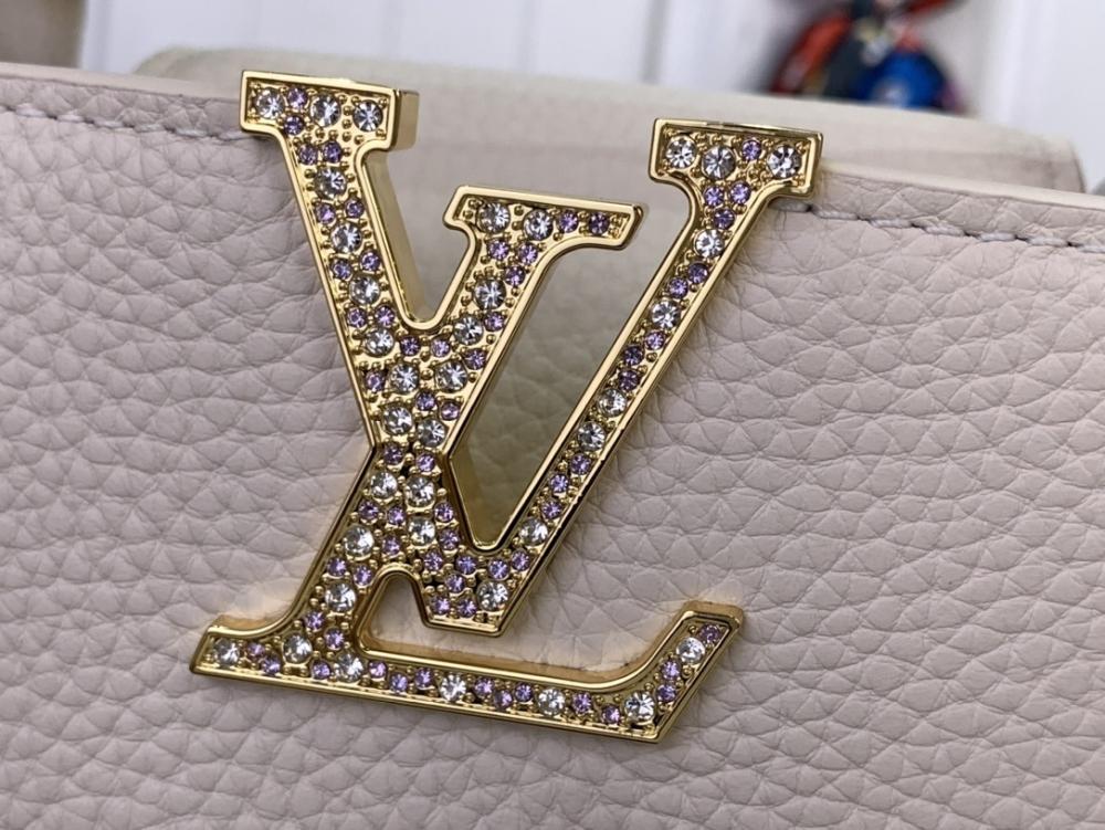 واجهة الحقيبة مزينة بشعار معدني بارز بتفاصيل لامعة تضيف لمسة فخمة، وتعطي الحقيبة مظهر يجمع بين الأناقة والفخامة بطريقة واضحة.